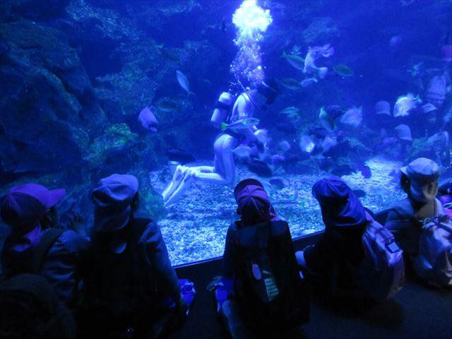 クラゲの水槽を前に、「ずっと見てられるわ~」とうっとりの子ども、イルカショーのイルカのジャンプに大興奮の子ども。えさやりダイバーさんに手を振る子ども…。